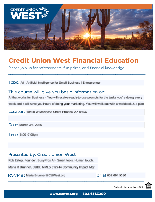 RSVP at Maria.Brunner@CUWest.org or at 602-694-5330​
